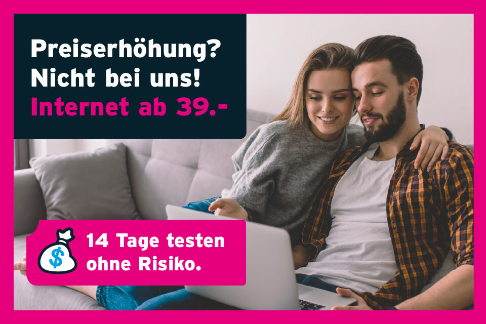 Überzeugen Sie sich selbst von unserem Internet. Nach Abschluss haben Sie 14 Tage Zeit, unser Angebot zu testen. Sollten Sie nicht zufrieden sein, können Sie innert 14 Tagen fristlos Kündigen.